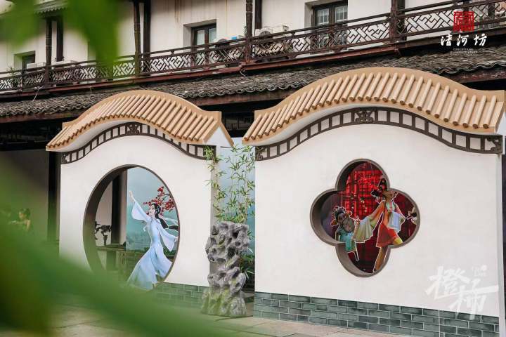 清河坊联动“如梦上塘”将大运河上的宋制婚礼场景搬到了清河坊的市井阳台。在四拐角抬头望,只见新郎“苏轼”戴着大红绸花,新娘“王弗”凤冠霞帔,在红绸带的牵引下,行礼、撒喜,于光影交错间上演浪漫场景。现场更有宋词飞花令等互动内容,沉浸式展现清雅飘逸的宋韵美学。
