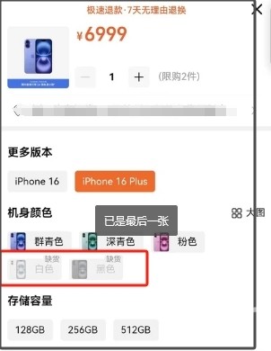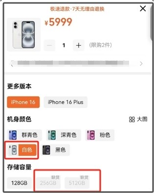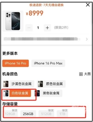 iPhone 16 Pro的沙漠色和白色也较为受欢迎,10分钟不到,小编点进天猫官方店发现各型号的白色款都已售罄。