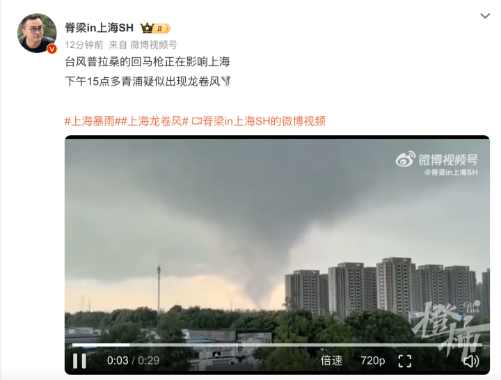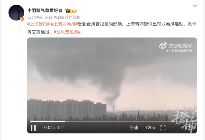 今天下午,台风“普拉桑”又搞事情了,多位气象爱好者爆料,上海青浦疑似出现龙卷风。