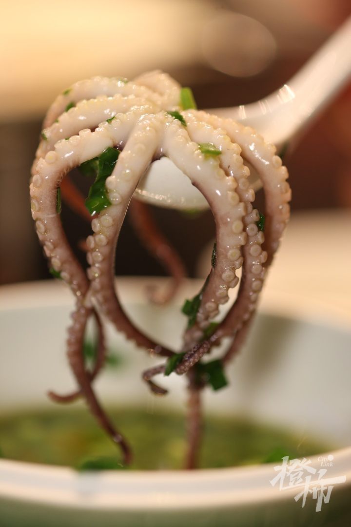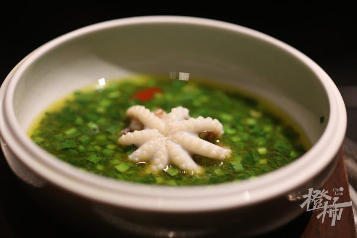 以及椒麻韭菜氽望潮,事先经过一番“敲打”的望潮软乎乎的,整个浸润于于飘着韭菜末的汤水中,吃来很是鲜嫩,汤水中椒麻味混合着韭菜味,很好地去了腥,同时提升了整个菜的鲜度。