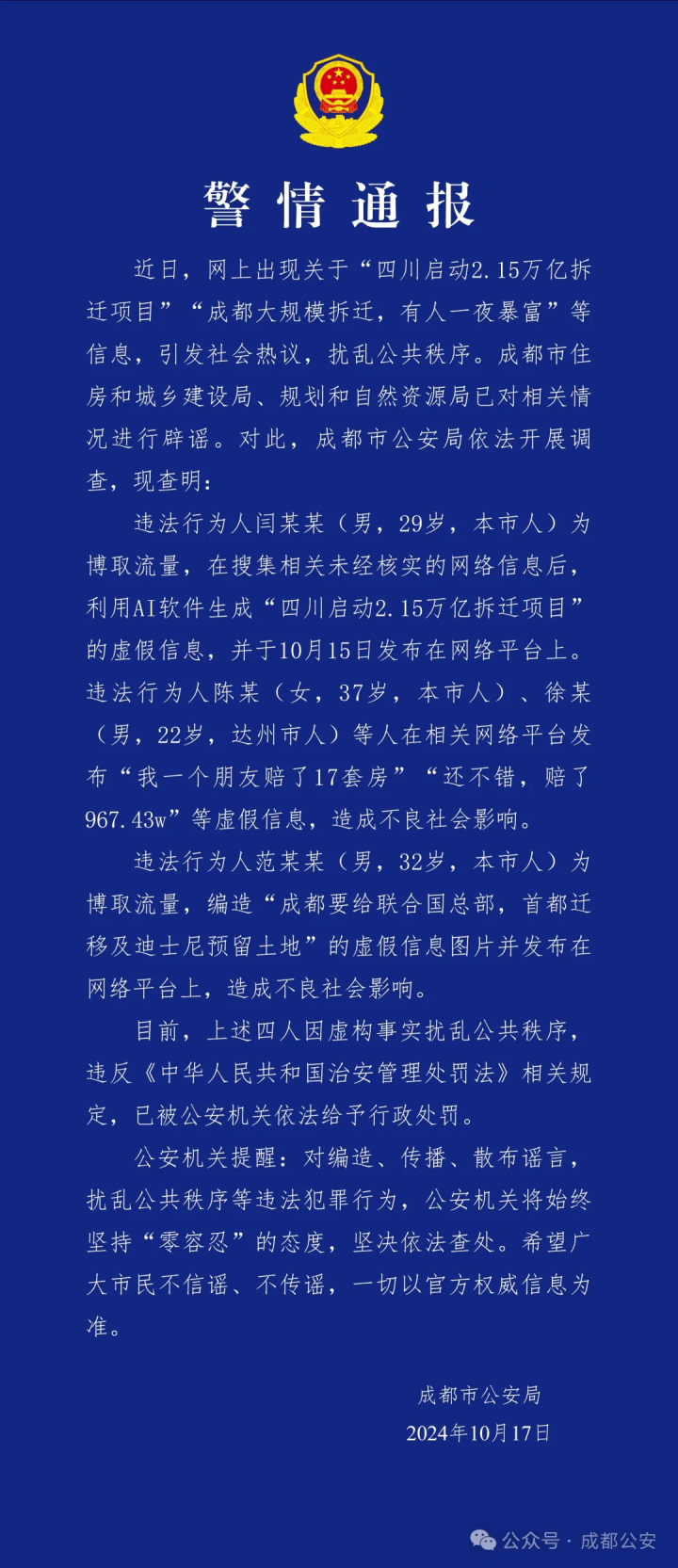 10月17日,成都公安微信公众号发布关于“四川启动2.15万亿拆迁项目”“成都大规模拆迁,有人一夜暴富”等信息的警情通报。