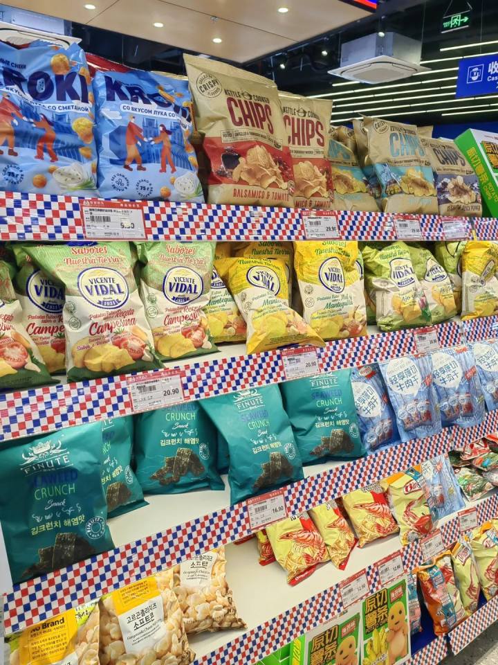 零食区域同样是惊喜满满,不少之前只能网购的爆款果糕、薯片、土豆泥产品都能在线下买到,而且记者现场比了个价,发现大部分零食产品的价格比线上购买还要优惠一些。
