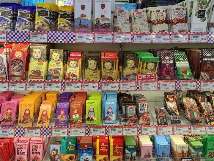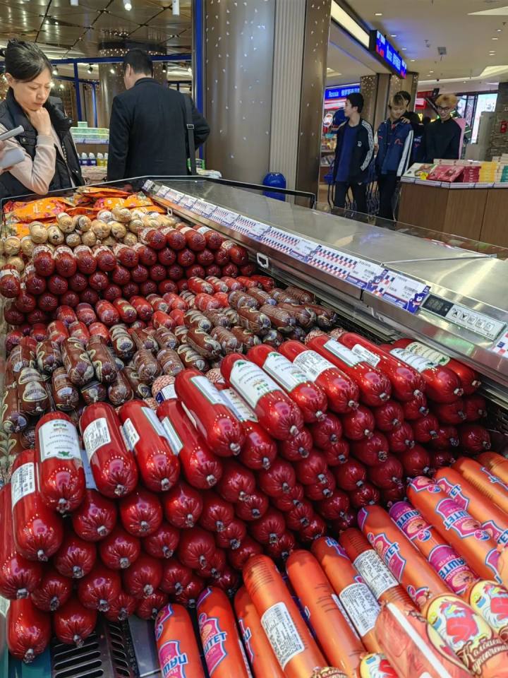 巧克力货架上以金色、紫罗兰、喀秋莎一类的品牌为主,都是比较出名的品牌,均价不到20元,冰箱里的冰淇淋有几十款,俄罗斯香肠有盘肠、俄式羊拐肠、鹿肉肠等,还有不同口味糖果占了整整两个货架。
