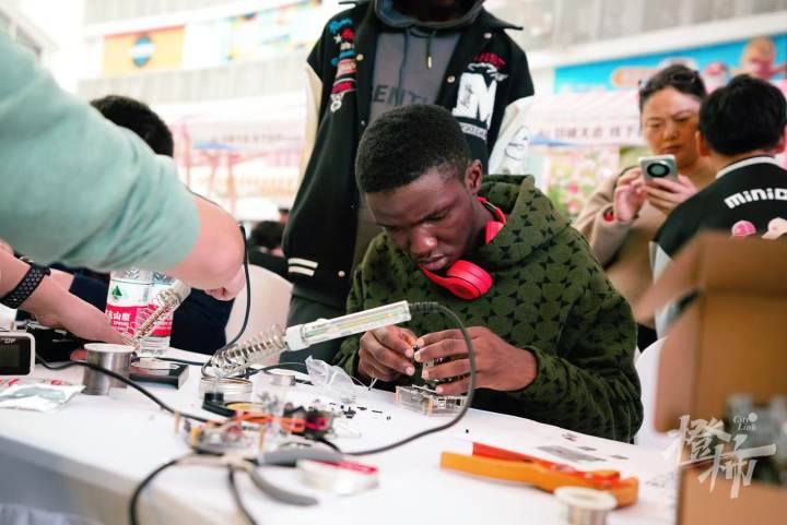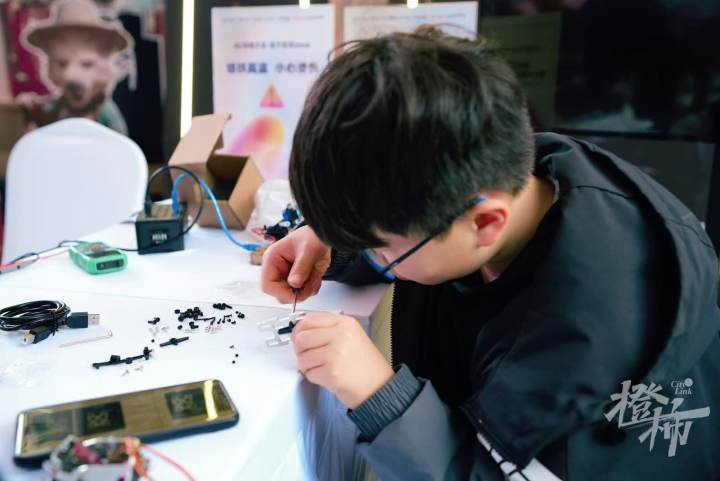 手搓,类似DIY,自己动手的意思。“大家可以体验亲手制作一个能和自己对话的机器人,绝对体验感爆棚,成就感满满。”摊主杨挺说,“因为涉及到电缆,所以比乐高难一点。原本这是为成年人设计的,没想到小孩子们也很喜欢。”