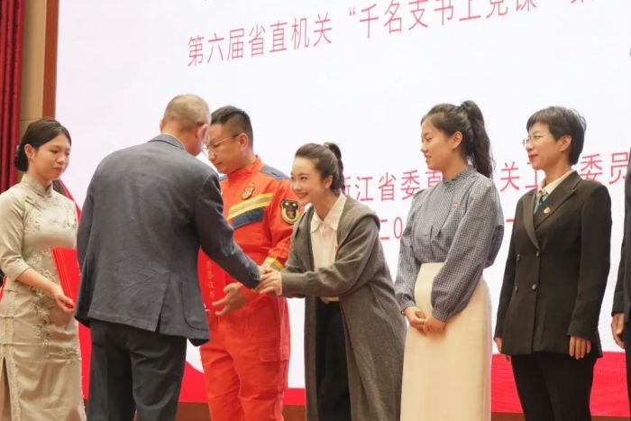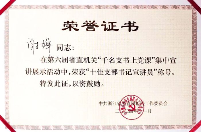 由浙江小百花越剧院党委选派,浙江省文化广电和旅游厅选送的浙江小百花越剧团党支部书记谢婵最终荣获“十佳支部书记宣讲员”称号。(初赛中获得小组第一名)。