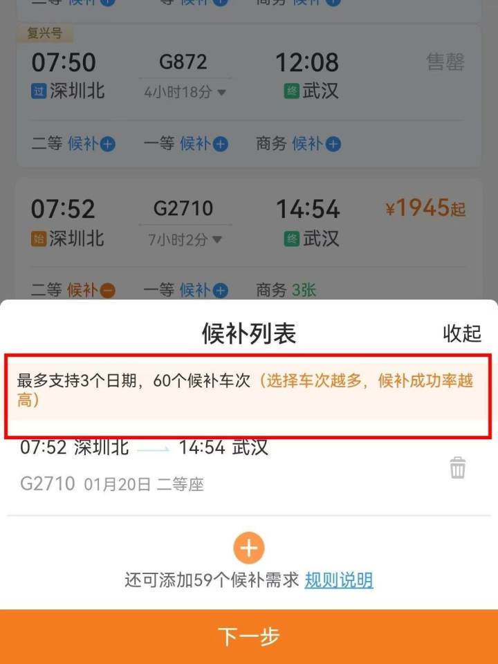 如果想增加春运“候补”成功的概率,可以多选几个车次,候补订单最多可以添加60个车次。