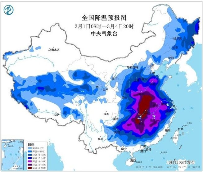 其中,预计,3月1日08时至3月3日08时,东北地区大部、华北中南部、黄淮大部、江淮西部、江汉、江南西部以及青藏高原北部和西部等地将降温6℃~8℃,其中,黑龙江东部、吉林东部、华北南部、黄淮中西部、江汉、江南西部等地的部分地区降温10℃~12℃,局地降温幅度可达14℃以上。