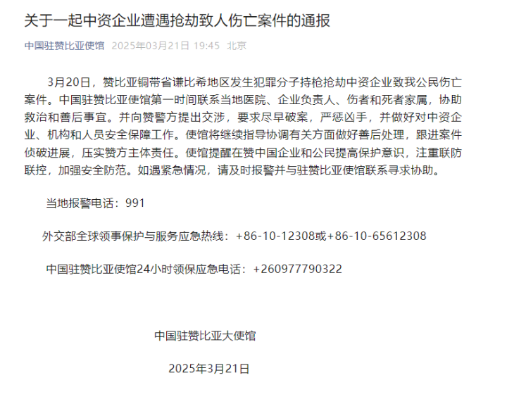 据中国驻赞比亚大使馆消息,3月20日,赞比亚铜带省谦比希地区发生犯罪分子持枪抢劫中资企业致我公民伤亡案件。中国驻赞比亚使馆第一时间联系当地医院、企业负责人、伤者和死者家属,协助救治和善后事宜。并向赞警方提出交涉,要求尽早破案,严惩凶手,并做好对中资企业、机构和人员安全保障工作。使馆将继续指导协调有关方面做好善后处理,跟进案件侦破进展,压实赞方主体责任。使馆提醒在赞中国企业和公民提高保护意识,注重联防联控,加强安全防范。如遇紧急情况,请及时报警并与驻赞比亚使馆联系寻求协助。