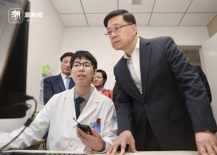 4月23日上午,李家超一行走进浙江大学医学院附属第一医院总部,了解智慧医院运作和应用医疗科技最新发展。自动化药物配送系统和先进机械人手术系统,让在场众人感叹科技带来的便利性。