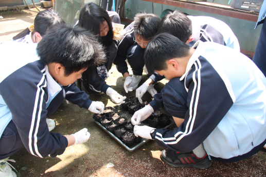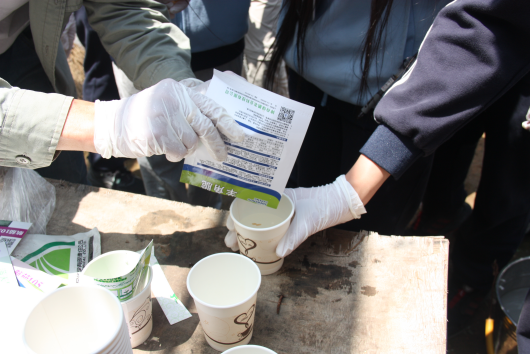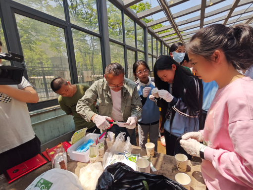 播种环节中,省农科院专家张弛先示范教学,教同学们在营养杯中松土、浇水、覆土,小心地将种子埋入土中。