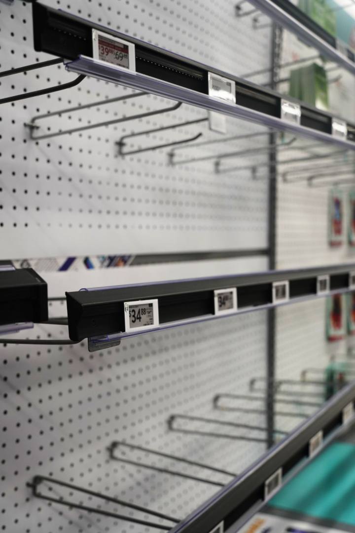 这是5月21日在美国加利福尼亚州旧金山湾区圣莱安德罗的一家沃尔玛超市拍摄的空荡的货架。新华社记者吴晓凌摄