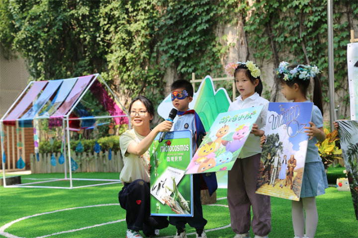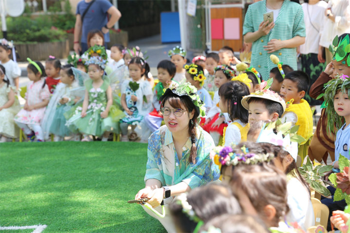 开幕式当天,阳光明媚,园内到处一片生机盎然,时空虫洞博物馆更是宛如绿野仙踪般的森林世界,展出着“Ai”探秘植物王国的专题展览。浙江大学幼儿园实验园全体师生都装扮成各种自然魔法世界的精灵,可爱唯美,造型精彩纷呈,齐聚于大草坪旁。在 Jason 老师的活力主持下,大二班越越小朋友先介绍了艺术周主题国旗下讲话,然后开幕式正式拉开帷幕。