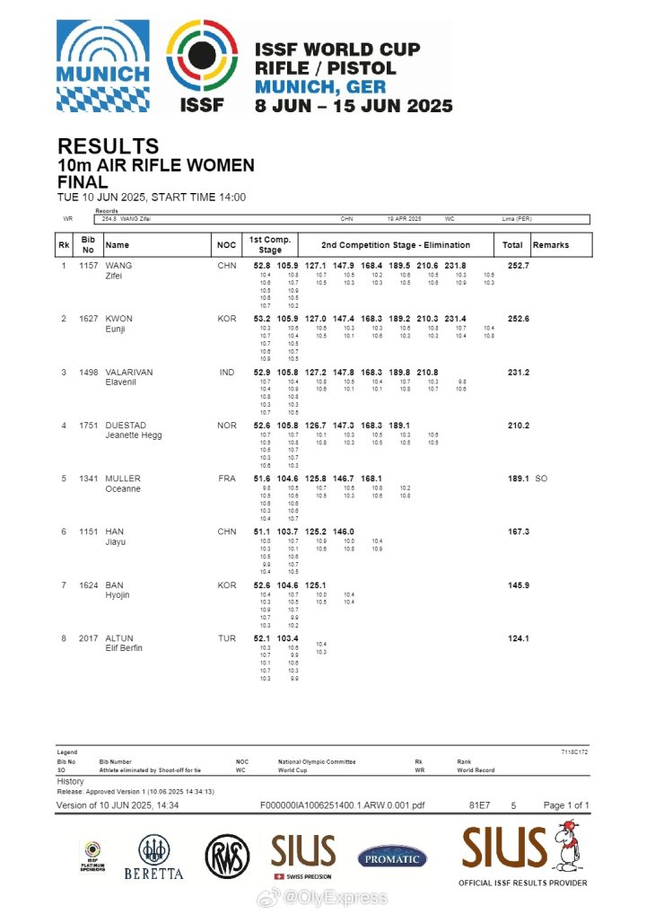 巴黎奥运会射击女子10米气步枪决赛中,黄雨婷0.1环憾负韩国选手潘孝珍,此次世界杯德国站比赛,王子菲以0.1环的优势战胜韩国选手权恩智,算是完成了“复仇之战”。