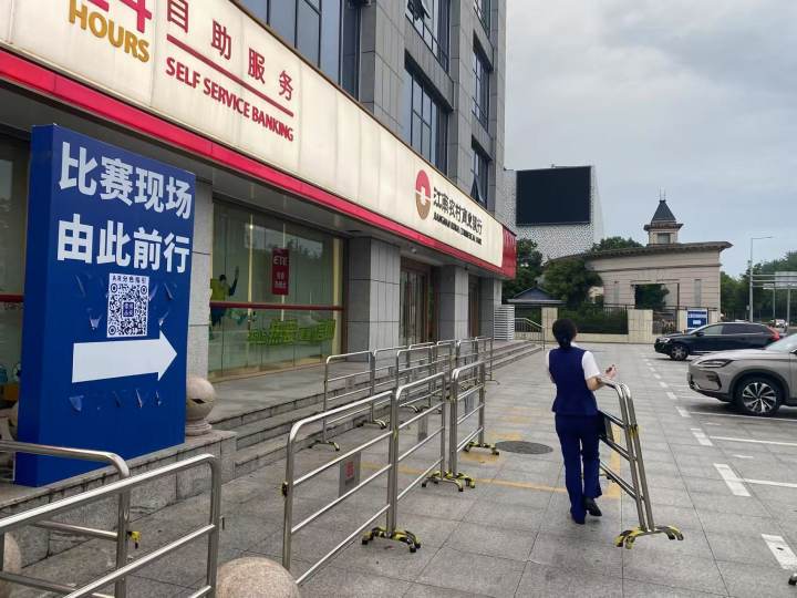 晚上7点左右,橙柿互动在常州奥体中心进入到场馆外围,看球的A、B、C各个通道都已经安排人员值班,还有工作人员正在加班竖立“苏超”宣传展板,球场外商家的集市也在紧锣密鼓地布置。
