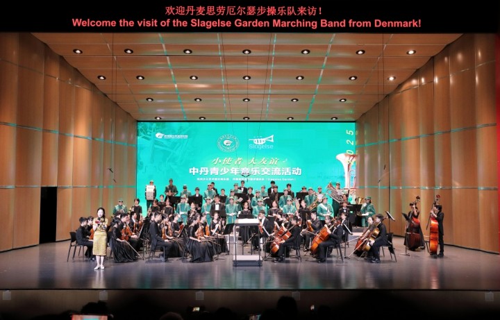 为庆祝中丹建交 75 周年,杭州少儿艺术团交响乐团与丹麦斯劳厄尔瑟步操乐队携手举办的“小使者· 大友谊——中丹青少年音乐交流活动” 在此进行。