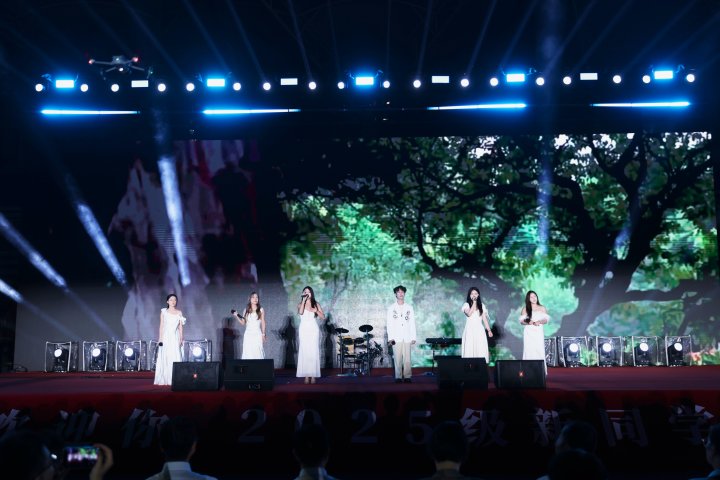 开学典礼落幕,主题为“拾光・启航”的迎新晚会紧接着点燃现场气氛。
