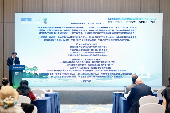 论坛聚焦植物多样性保护的全球挑战与实践探索,强调保护区、植物园与社区三方的互补与协同。来自联合国教科文组织、国内外植物园、自然保护区及社区的200余位专家学者与保护实践者齐聚杭州,围绕保护协同机制创新、国家植物园体系建设经验、公众教育与社区共建等议题展开深入探讨,共同发布《植物多样性保护倡议》。