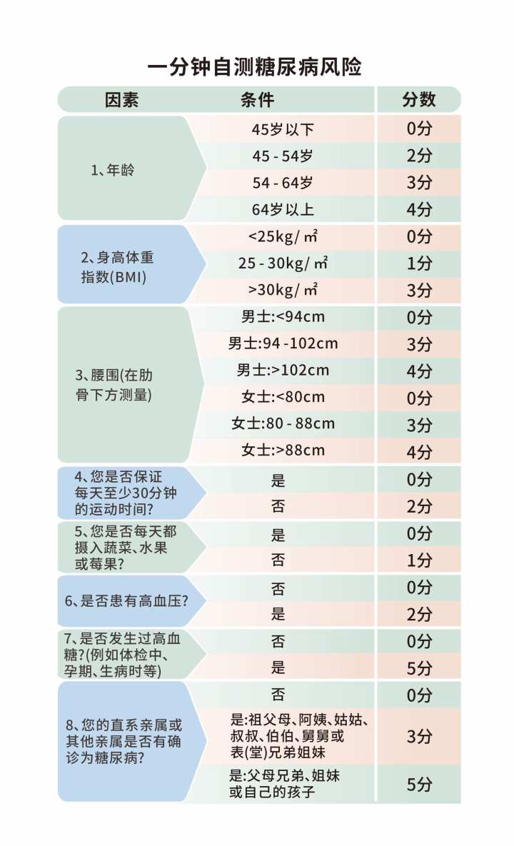 为帮助公众更深入地了解糖尿病的发病因素,并审视自身生活习惯与糖尿病之间的潜在关联,我们特别引用了由芬兰赫尔辛基国家卫生和福利研究所兼职教授 Jaana Lindström 与 Jaakko Tuomilehto 教授共同设计与开发的糖尿病风险自测表。通过简单测试,帮助大家快速评估自身罹患2型糖尿病的风险水平。
