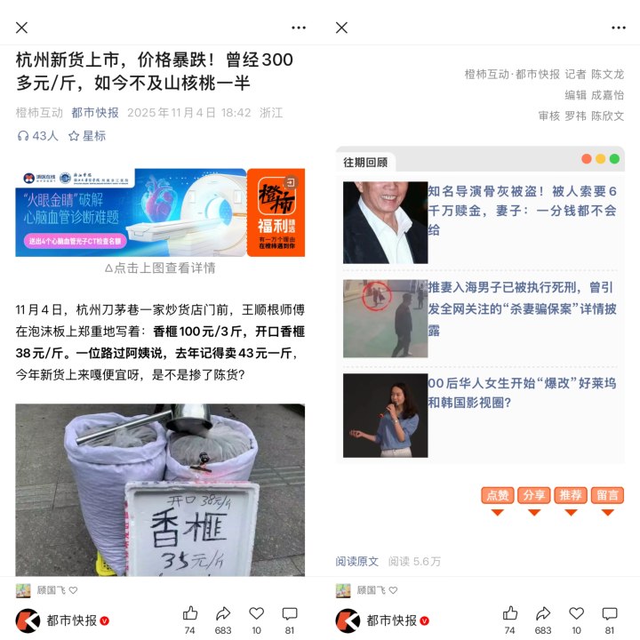 昨天,橙柿互动·都市快报官微发布了《100元3斤,售价不及山核桃一半,浙江坚果“爱马仕”为何跌跌不休?》,文章迅速冲上热搜,官微发布数小时阅读数量突破5.6万人次。