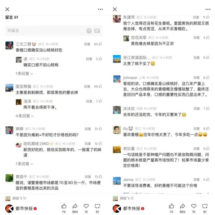 很多粉丝在后台留言,多数人认为:香榧掉价是由于产量暴涨,消费人群没有扩展,加上口感不如山核桃,消费体验不好……