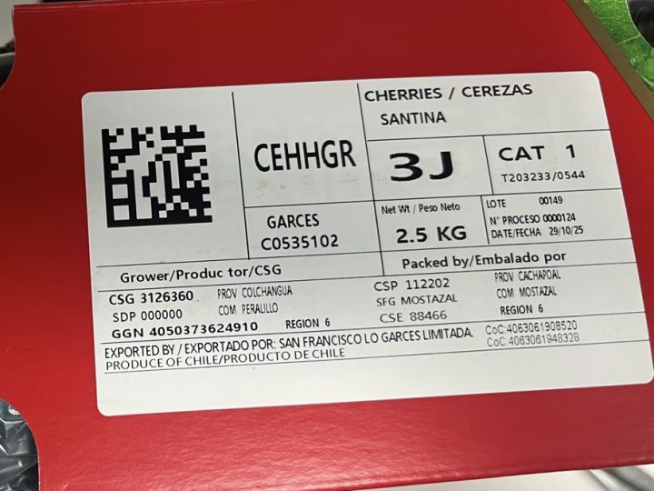 这箱智利车厘子的生产日期标注为2025年10月29日,11月8日已经送到了中国消费者的手上⬆️
