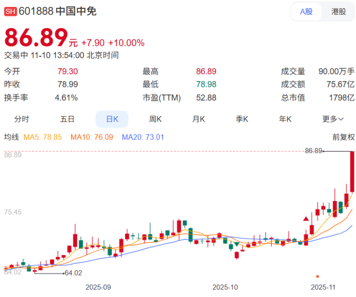 今日,A股消费股出现了久违的上涨行情,其中免税龙头中国中免强势涨停,最新价报86.89元/股。