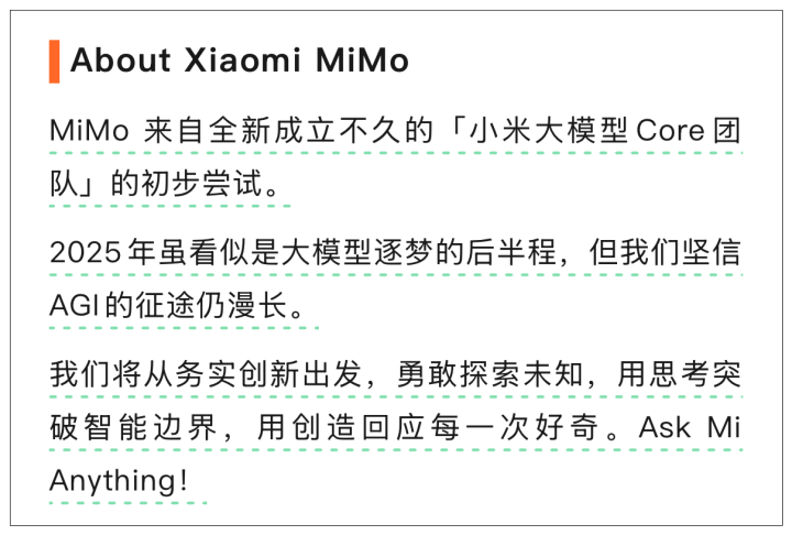 就在Xiaomi MiMo发布的那天,小米大模型Core团队在官方公众号推文里如是写道:“2025年虽看似是大模型逐梦的后半程,但坚信AGI的征途仍漫长。我们将从务实创新出发,勇敢探索未知,用思考突破智能边界,用创造回应每一次好奇。”
