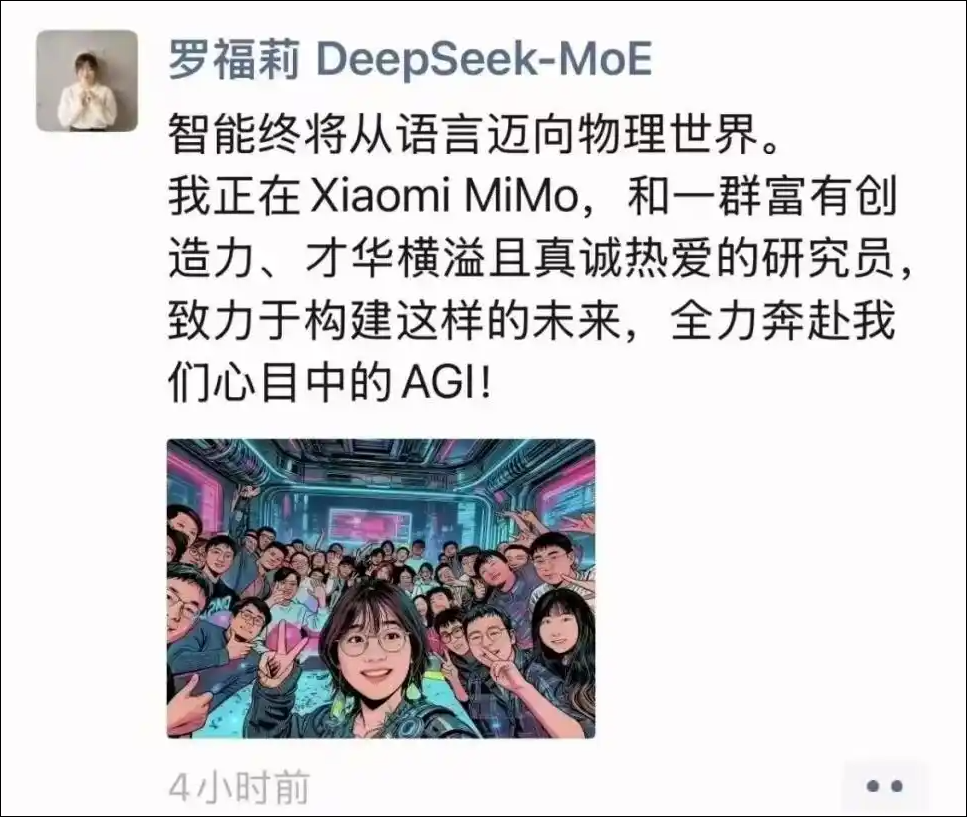前DeepSeek研究员,有“AI才女”之称的罗福莉加入小米。今天,她在朋友圈和海外社交平台账号上写道:“智能终将从语言迈向物理世界。我正在Xiaomi MiMo,和一群富有创造力、才华横溢且真诚热爱的研究员,致力于构建这样的未来,全力奔赴我们心目中的AGI。”