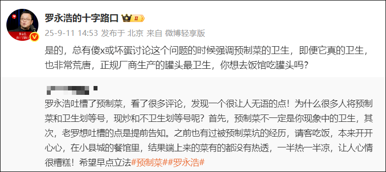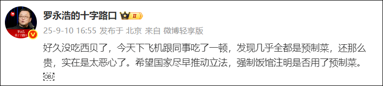 9月10日,知名企业家罗永浩发博吐槽知名连锁餐饮品牌西贝。其称:好久没吃西贝了,今天下飞机吃了一顿,发现几乎全都是预制菜,还那么贵,实在是太恶心了。希望国家尽早推动立法,强制饭馆注明是否用了预制菜。