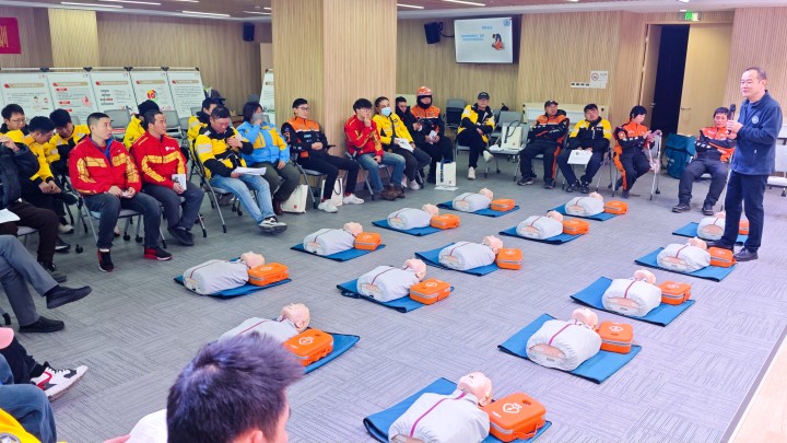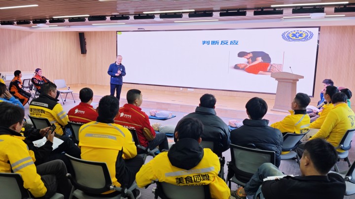 在首场培训中,市急救中心专业培训团队先是给“小哥”们上了一堂“理论课”,教大家如何进行心肺复苏(CPR)、使用自动体外除颤器(AED),以及面对常见意外伤害(如溺水、触电、气道异物阻塞等)和急症(如意识不清、休克、呼吸困难等)时怎样施展救援。