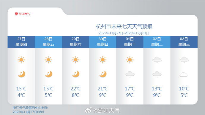 这次降温过后,直到12月2日左右下一波冷空气到来之前,杭州的最高气温仍将回升至20-22℃,这个周末又将是晴朗舒适的好天气。
