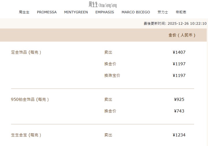 记者查询国内品牌金价,周生生足金饰品标价1407元/克,较前一日1397元/克的价格上涨10元/克。 老凤祥足金饰品标价1413元/克,较前一日1398元/克的价格上涨15元/克。