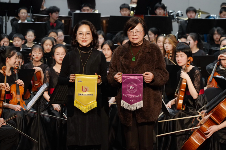 随后,杭州青少年活动中心党委专职副书记、纪委书记徐洪女士与江西文演演出院线有限责任公司行政总监龚丽娟女士登台,交换团旗。这面旗帜,见证着杭赣青少年艺术交流的崭新起点。